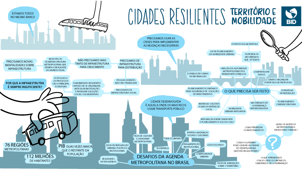 Foram desafios como esses que levaram o Governo Federal por meio do Ministério do Desenvolvimento Regional (MDR) e do Ministério da Economia (ME), em parceria com o BID, a organizaroseminário internacional e o workshop“Território e Mobilidade. O desafio da construção de um modelo de gestão metropolitana sustentável no Brasil”.O evento buscou promover debates sobre as necessidades atuais das áreas metropolitanas no Brasil, apontando possíveis soluções para a construção de uma política metropolitana de mobilidade urbana baseada em respostas integradas do território e dos sistemas de mobilidade sustentável. Houve uma ativa participação de especialistas nacionais e internacionais dos temas de mobilidade, desenvolvimento urbano e governança metropolitana dos municípios, dos estados e da federação, assim como de pesquisadores e atores do setor privado.